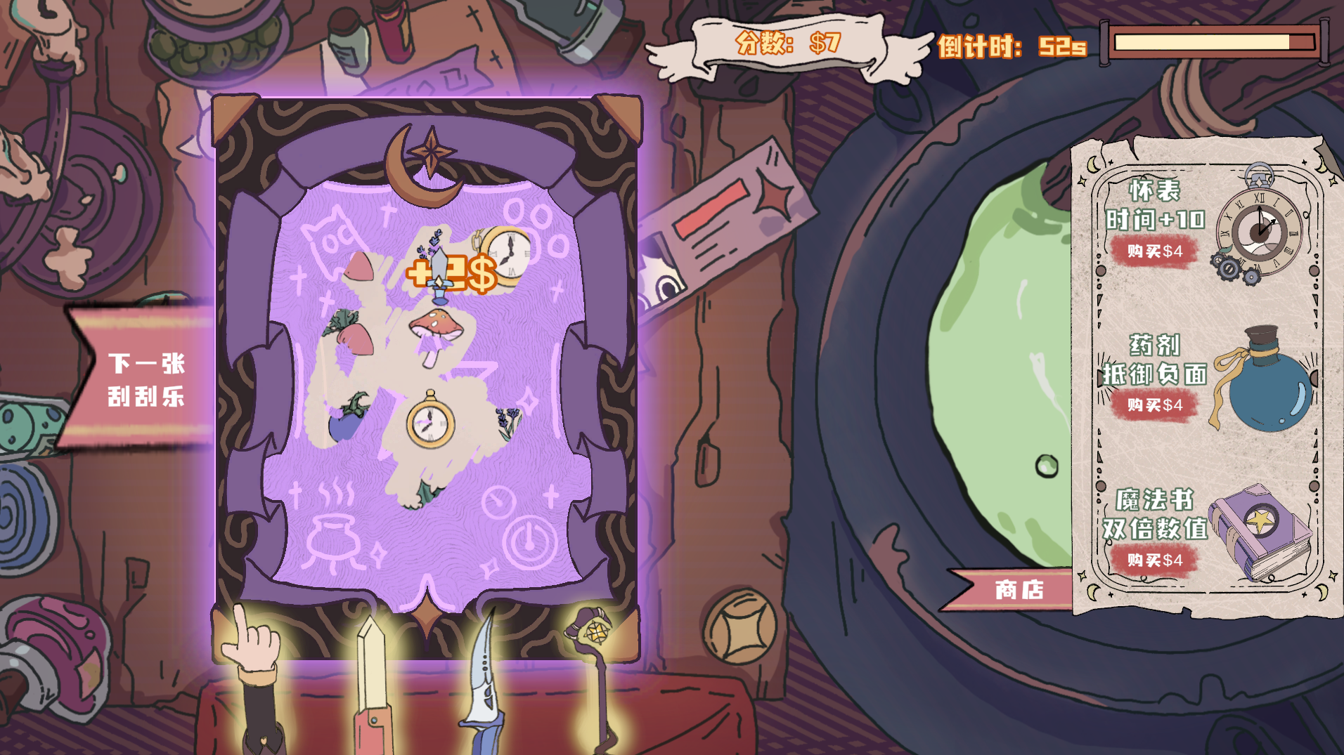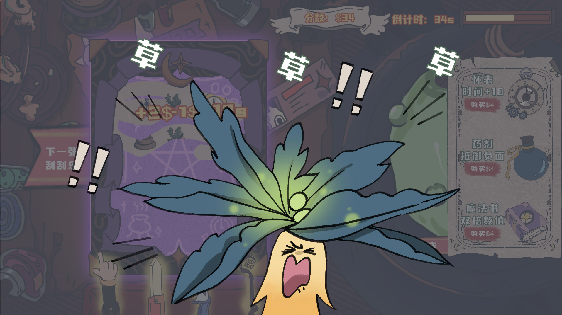 Within a 60-second countdown, they need to scratch off randomly generated scratch cards to collect herb and item icons to earn points, while avoiding negative effects and deadly bombs to achieve high scores and unlock different endings.